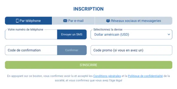 Cliquez sur le bouton d’inscription sur cette page, choisissez votre méthode (un clic, téléphone, e-mail ou réseau social), sélectionnez le MAD comme devise et validez. Le compte est actif immédiatement.